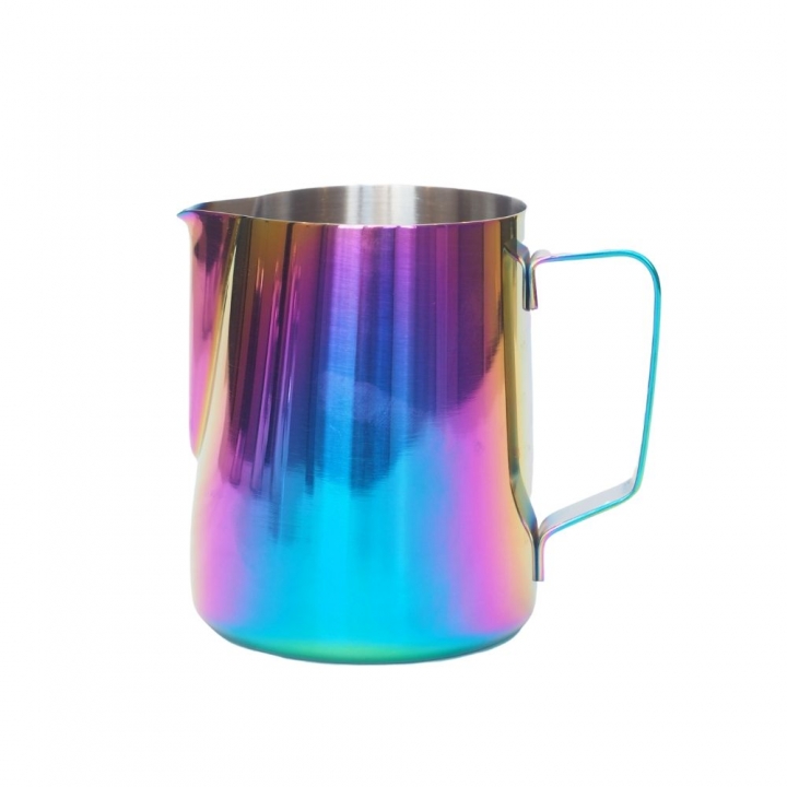 Rainbow style stainless steel milk jug with pointed cast spout.